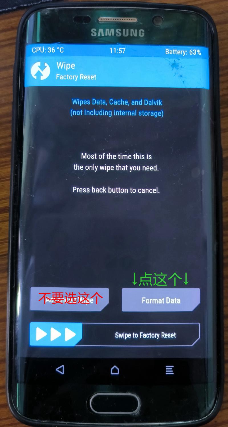 - 进入 Wipe 菜单,选择 Format Data,并注意不要选择 Advanced Wipe,输入 yes 以确认清除系统数据